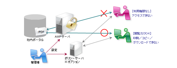 「ポリシーサーバオプション」は、ユーザ管理機能と連携し、コンテンツに対してユーザ/グループ(部署)単位で保護を設定して利用制御を行えます。