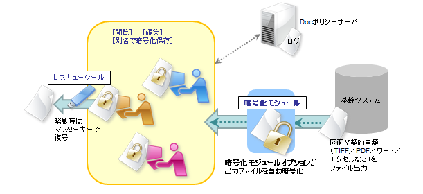 また、暗号化権限として「閲覧」「編集」「別名で暗号化保存」を設定することで、ダウンロードした暗号化ファイルを編集して暗号化保存できるようにしました。ファイルを開くときにはパスワードで保護され、編集した後も再度暗号化されるので、安全性を継続できます。