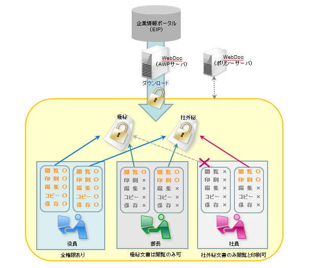 - 企業情報サイト(EIP)からファイルをダウンロード時に、自動的に利用権限を付与できる