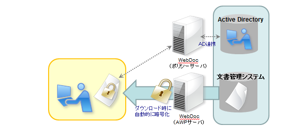 「パイレーツバスター WebDoc」は、Webシステムからファイルがダウンロードされるときに自動的に暗号化し、ダウンロード後のファイルは印刷やコピーなど権限を与えられた人しか利用できず、情報の不正利用を防止するソフトです。