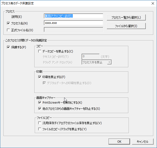 特定アプリケーションだけを利用制御したい場合は、「保護ポリシー」にそのアプリケーションのプロセスを指定し、データコピー/印刷禁止や起動禁止を設定できます。