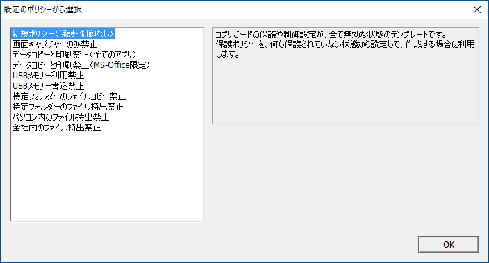 コプリガードには、管理者の負担を減らすため、保護したい対象や目的に合った「保護ポリシー」のテンプレートを用意しています。「画面キャプチャーのみ禁止」「特定フォルダーのファイルコピー禁止」など、テンプレートから選ぶだけで、「保護ポリシー」が自動的に作成されます。