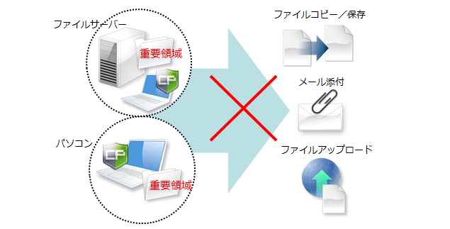 ファイルサーバー上の共有フォルダや、固定ドライブ内の特定フォルダを「重要領域」に指定して保護し、そこからのファイルコピー/保存を禁止できます。メール添付やアップロードも禁止できます。