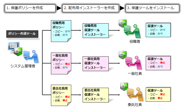 「コプリガード」の使い方は、管理者が保護ポリシーを作成し、それを基にしたインストーラーを出力して、利用者のPCにインストールします。