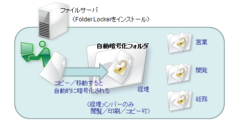 事前に印刷/保存などの利用権限を付与した「自動暗号化フォルダー」を作成しておくと、そのフォルダーにファイルを移動/コピーするだけで、自動的に利用権限が付与されて暗号化されます。手軽な運用で、しっかり情報漏洩防止対策ができます。