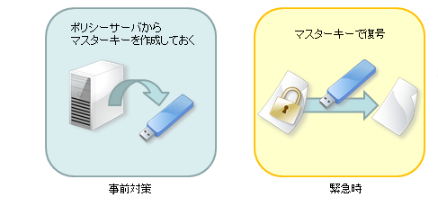 災害や事故など不測の事態で、ポリシーサーバーが機能しなくなった場合は、暗号化ファイルを閲覧できなくなります。この有事対策(BCP)として、マスターキーで暗号化ファイルを救済できる「レスキューツール」を用意しています。