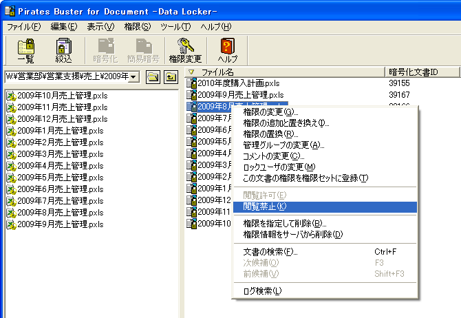 「パイレーツバスター Doc」は、ファイルに付与された権限(印刷/コピー/画面キャプチャー/プリントスクリーン/保存)どおりに利用でき、権限以外の操作を禁止する情報漏洩対策ソフトです。