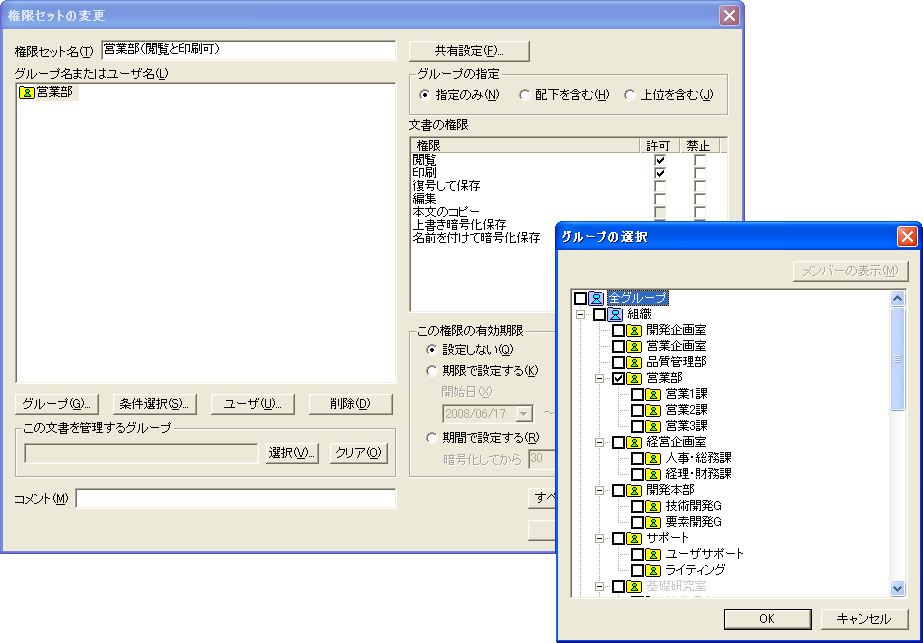 ダウンロード時にファイルに付与する利用権限(閲覧/印刷/編集/コピー/保存)は、グループ/ユーザー単位で設定します。