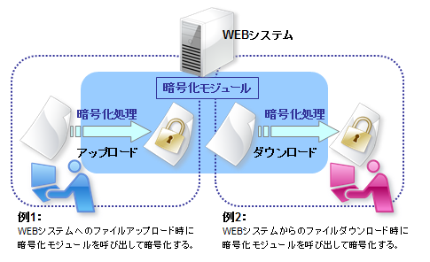 ファイルを管理するグループウェアや、ファイルをアップロードして利用するようなWebシステムにおいて、アップロード時やダウンロード時に暗号化モジュールを呼び出すことでファイルを暗号化し、その暗号化ファイルをユーザーに利用させるようなシステムを構築できます。