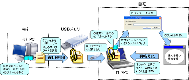 - 会社PC: セキュアプライム UFEをインストールし、持ち帰るファイルをUSBメモリにコピーしておきます。(自動暗号化されます)